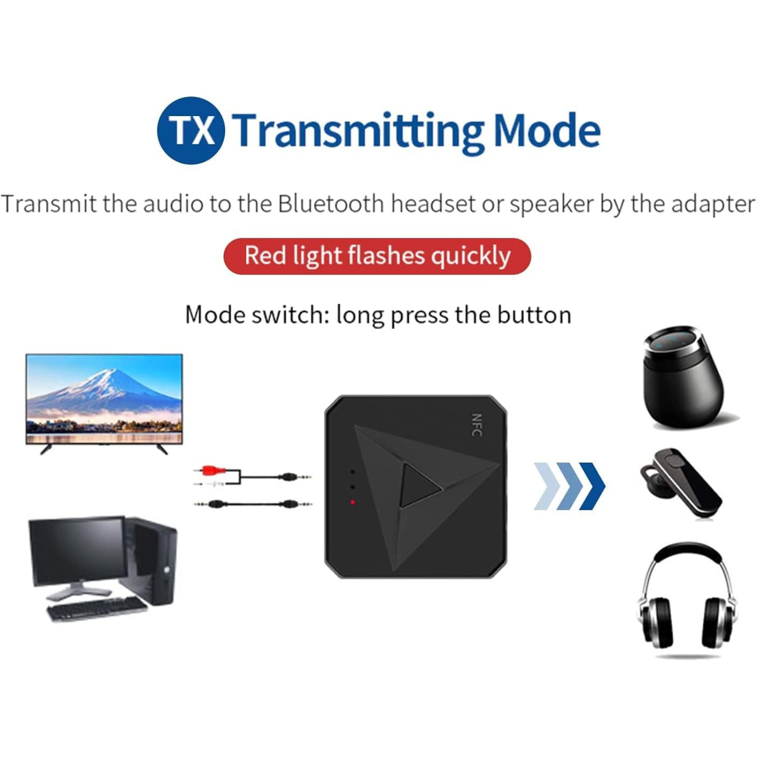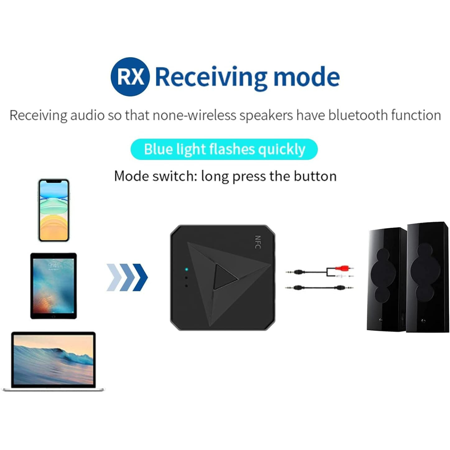 محول صوت بلوتوث يدعم الإرسال والاستقبال (TX/RX) مع تقنية NFC لاقتران سريع وصوت ستيريو مستقر، مناسب للتلفزيون، الكمبيوتر، السيارة، السماعات، وسماعات الرأس.