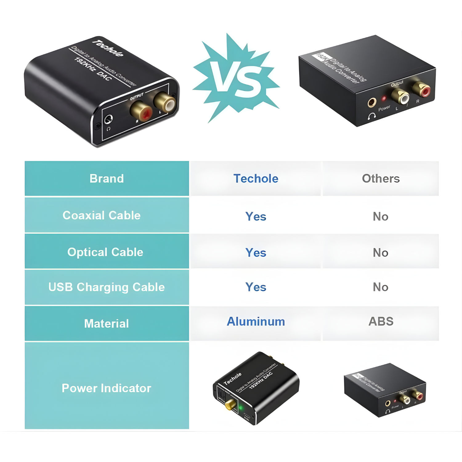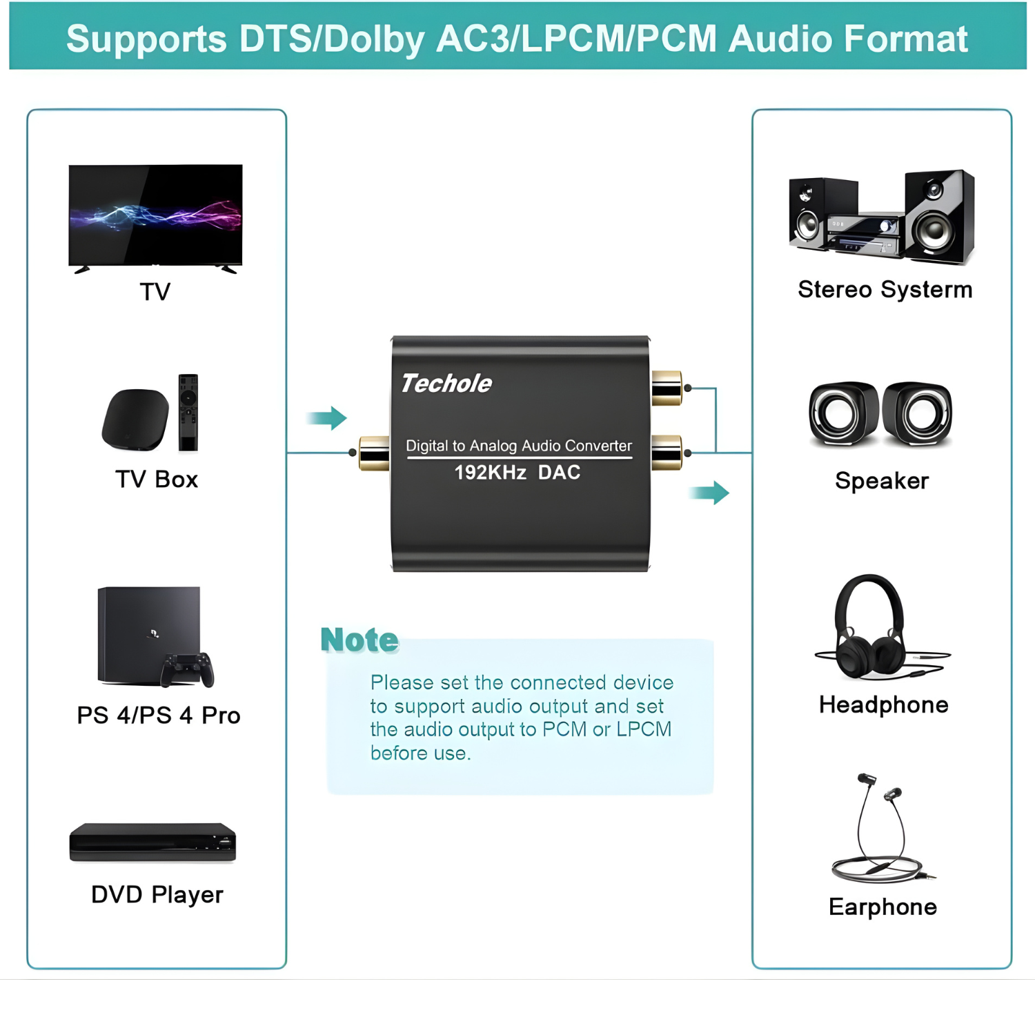 محول صوت رقمي إلى تناظري Techole – Optical / Coaxial إلى RCA و 3.5mm (192kHz)