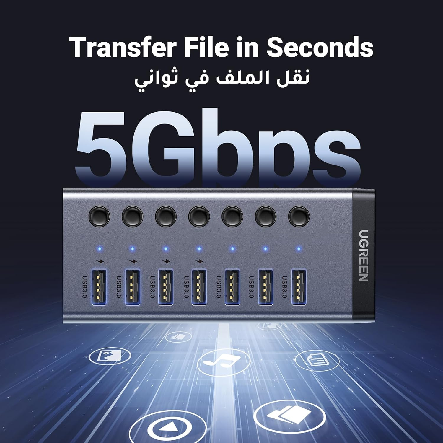 وسّع إمكانيات جهازك بكل سهولة مع UGREEN USB Hub 3.0، الحل المثالي لتحويل منفذ USB واحد إلى 7 منافذ USB 3.0 عالية السرعة مع دعم الطاقة الخارجية لتشغيل وشحن الأجهزة بثبات وأمان.