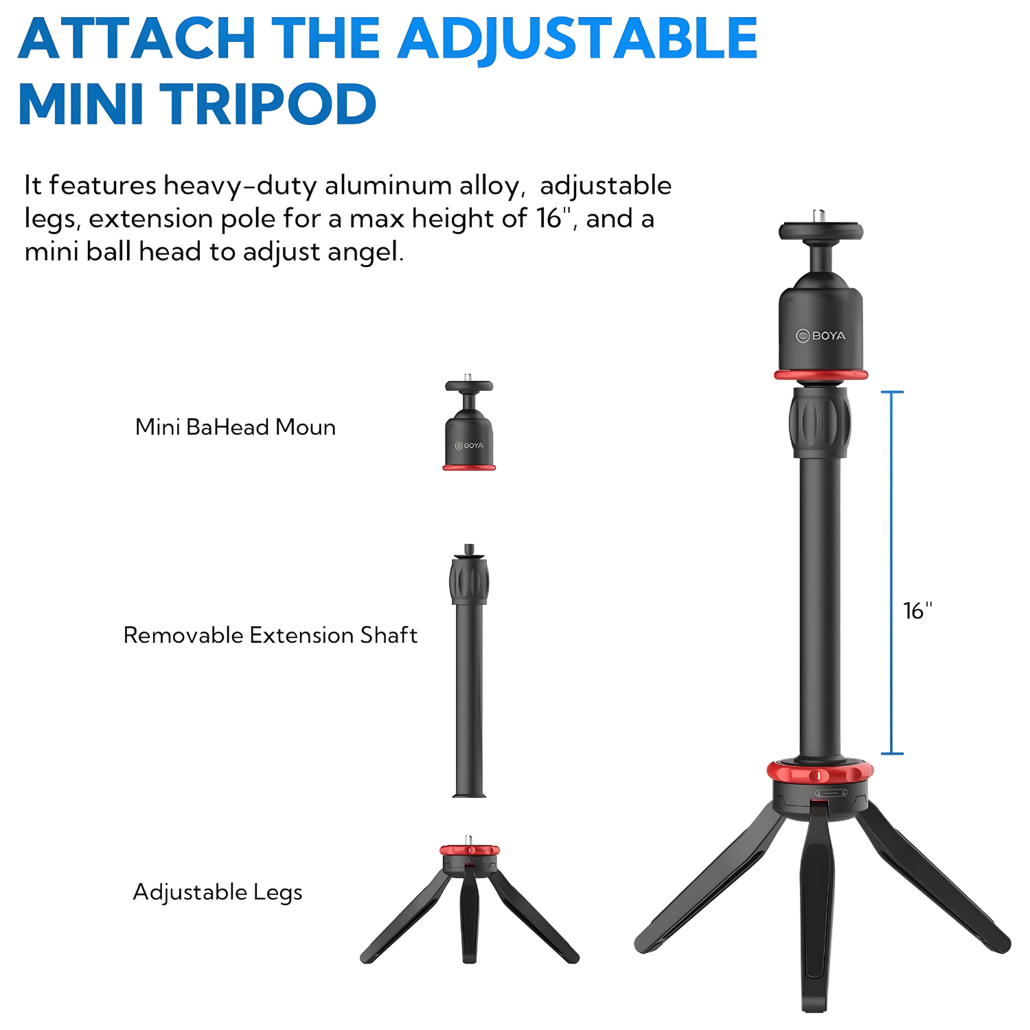 🦾 تصميم متين وقابل للتعديل: هيكل من الألمنيوم مع ترايبود قابل للتمديد وزاوية تصوير مرنة.